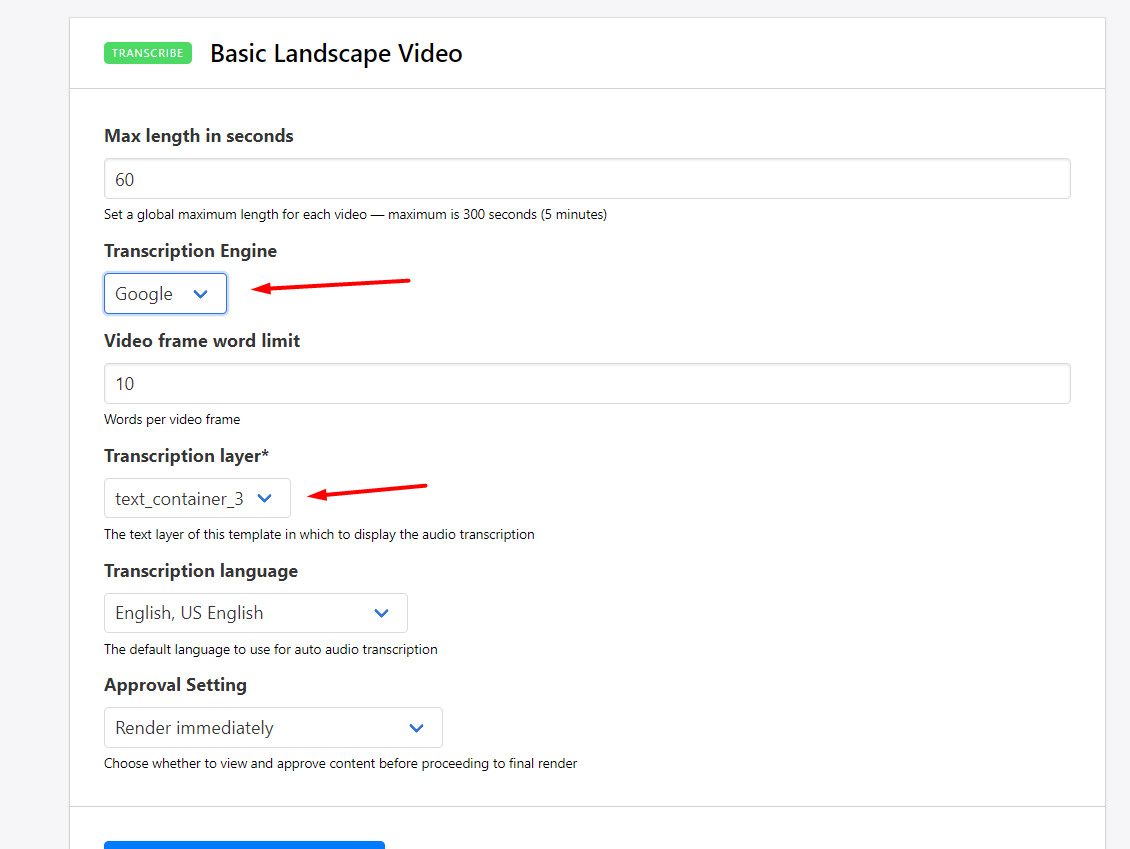 - Video frame word limit (Google only) - you can change this to your liking and it will affect how Bannerbear splits up the text into different frames.