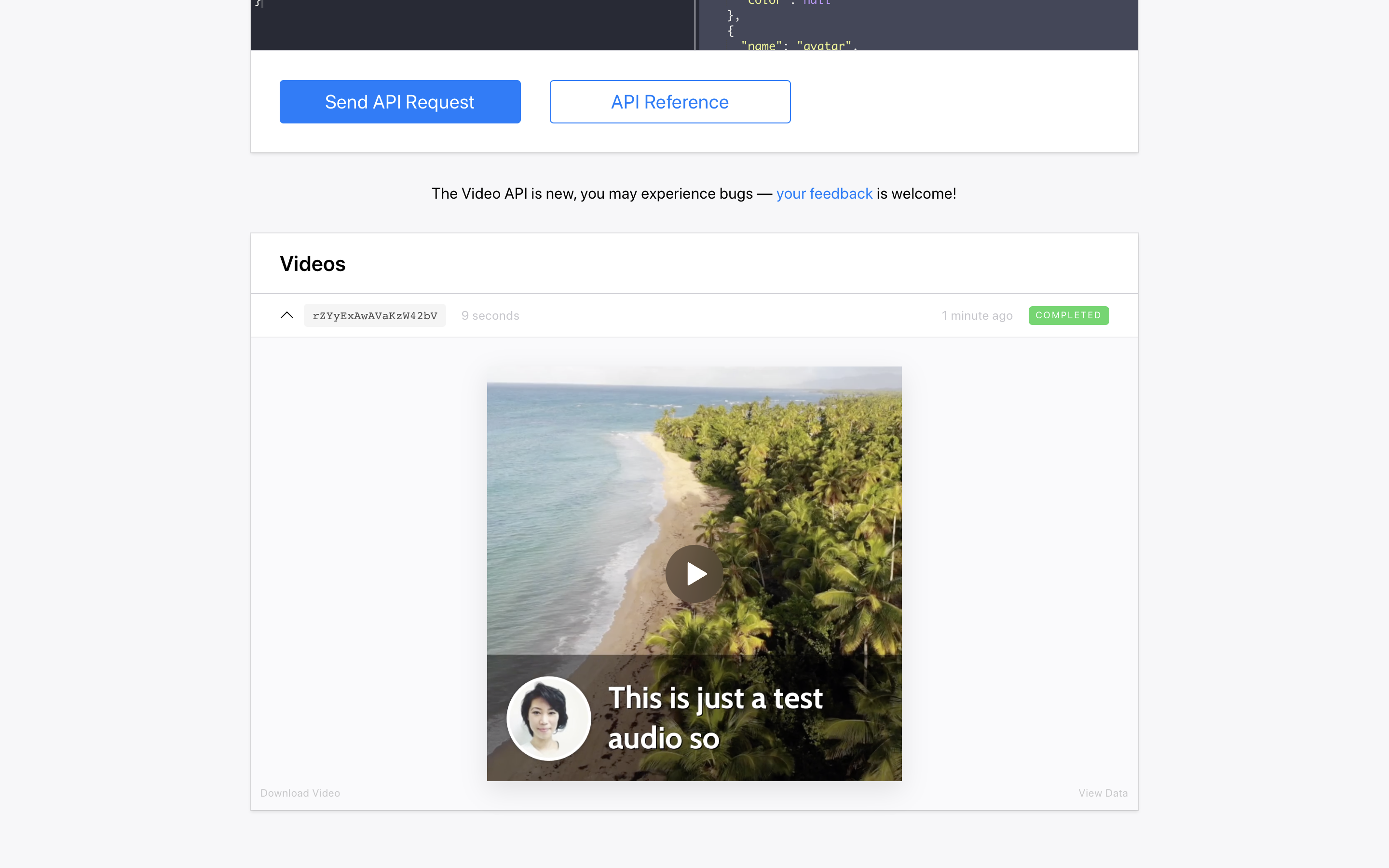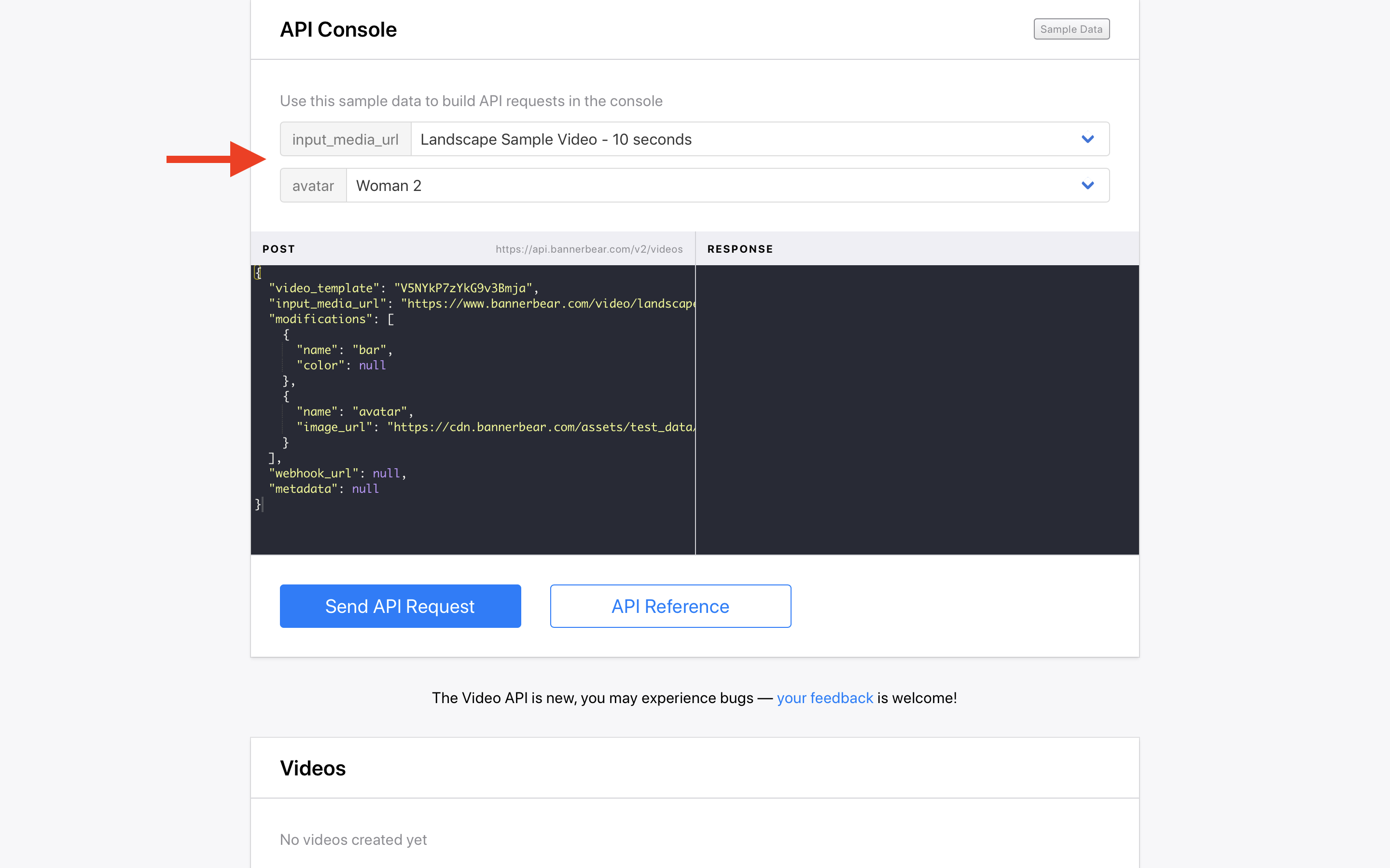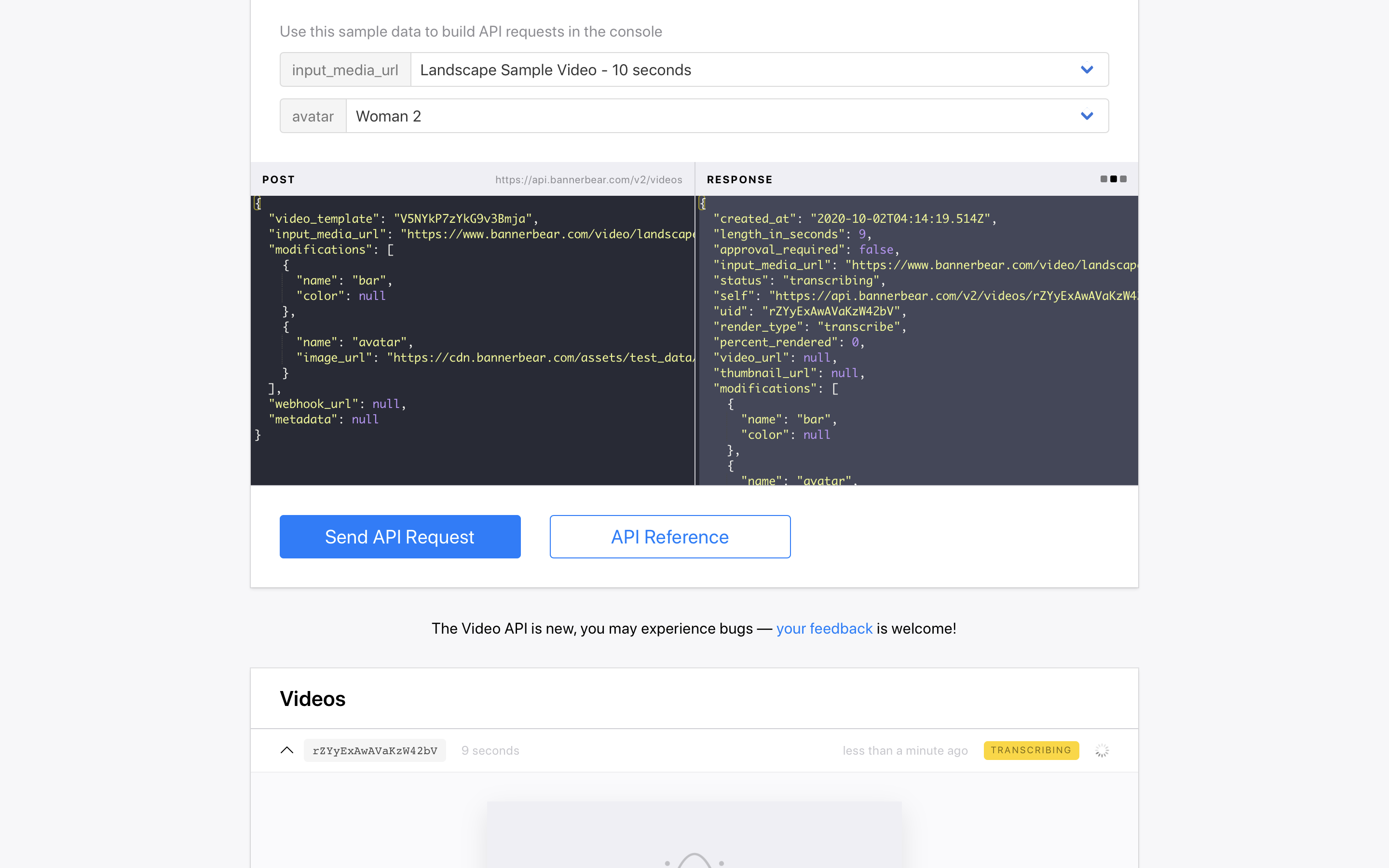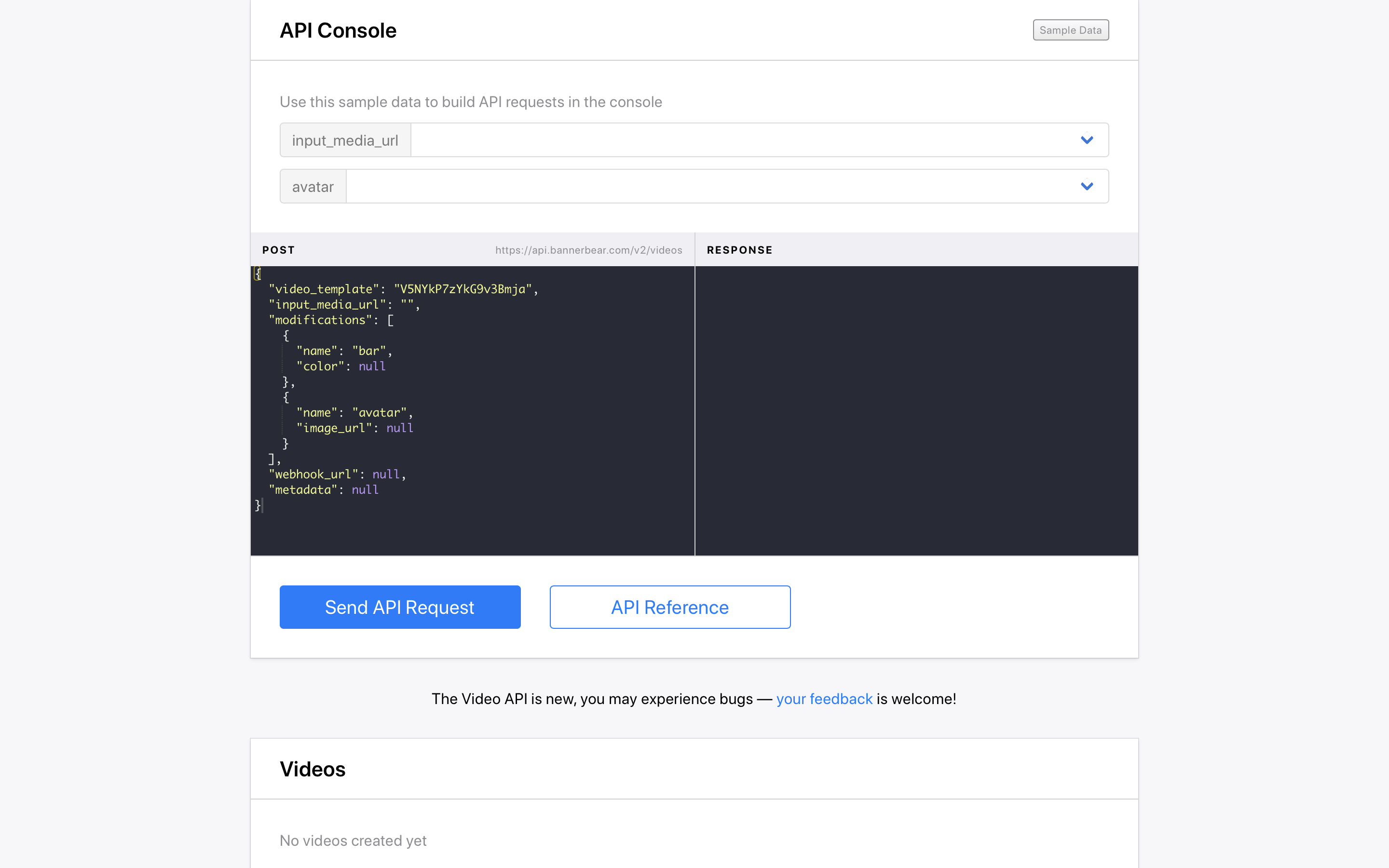 This should look pretty familiar to you if you've used the Image API before. It's the same, except this time the API console hits the /videos endpoint and the sample data panel has some video-related sample video and audio files that you can use in your tests.