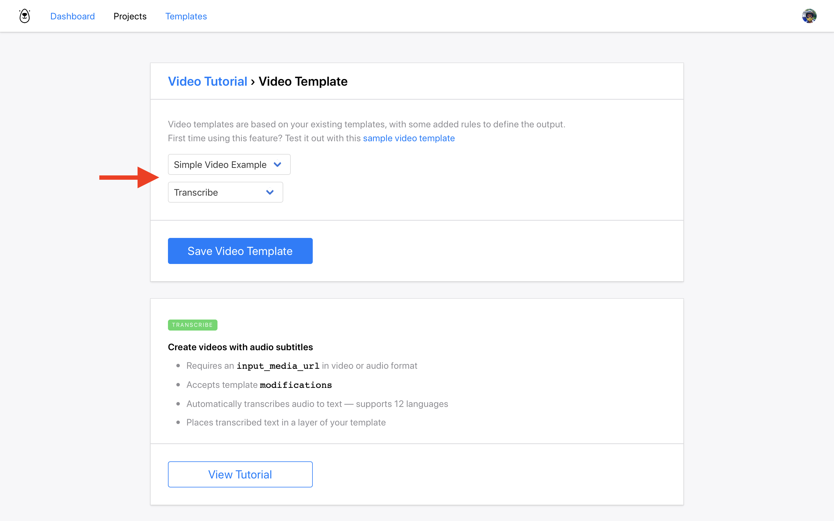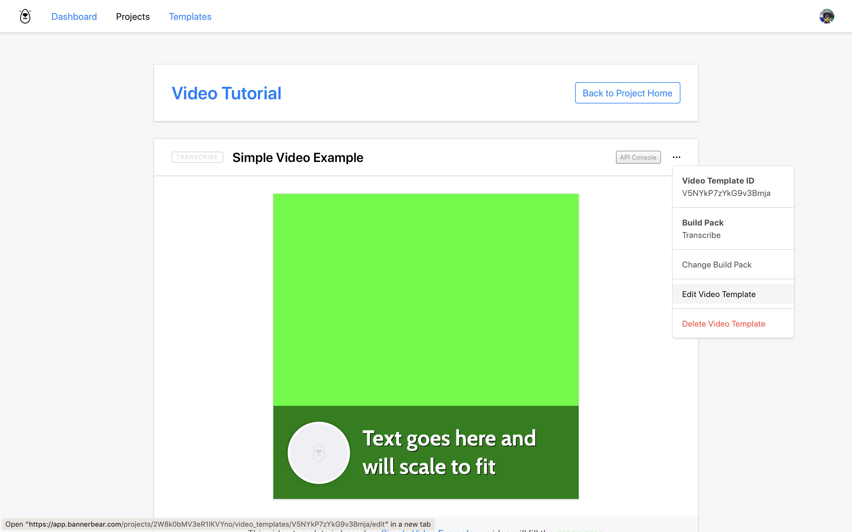 Choose your Simple Video Example template and choose Transcribe as the build pack. Think of "Build Packs" as a set of video behaviors / animation rules. There will be more Build Packs to choose from in the future. Hit Save.