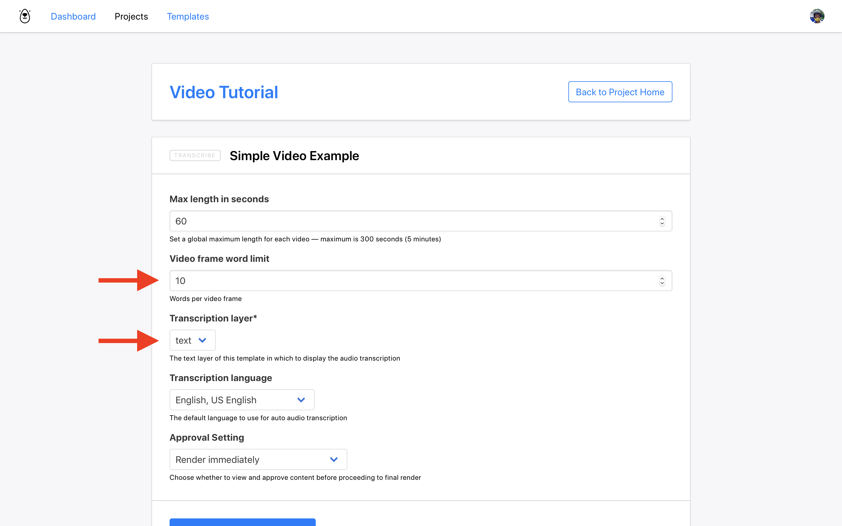 Video Templates using the Transcribe build pack need a few settings before you can start auto-generating videos.