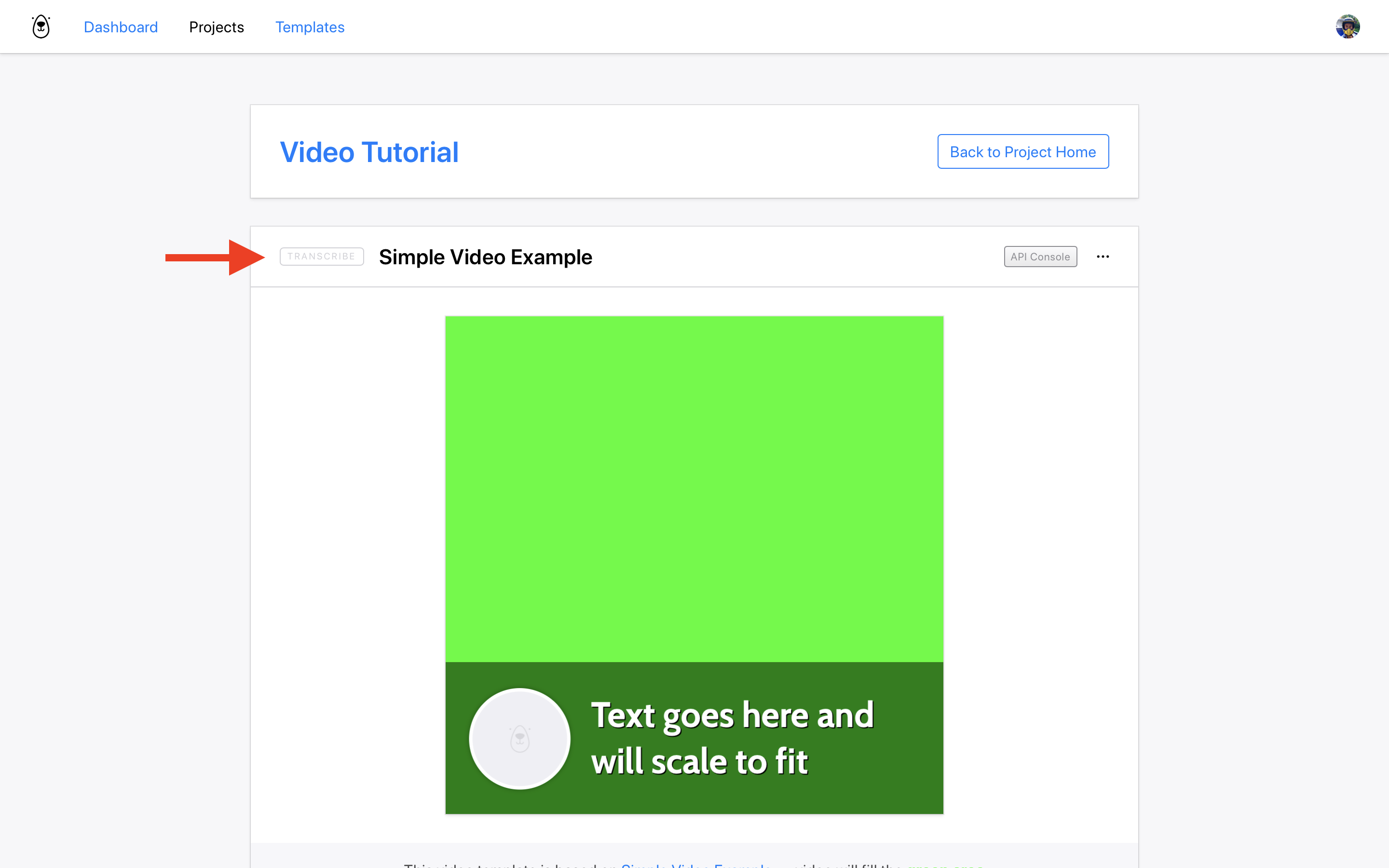 You will now be on your new Video Template API test screen. It looks a lot like the Image Template screen but you can tell the difference as the Video Build Pack Transcribe is displayed in the title: