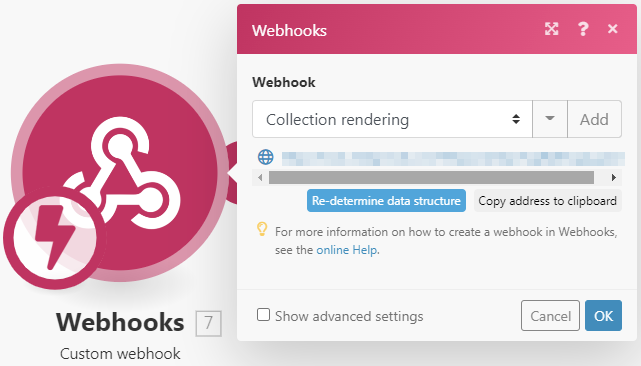 Note: This will generate a webhook URL, which you should copy and paste into the "Webhook URL" field in the Create a Collection module mentioned in the above scenario.