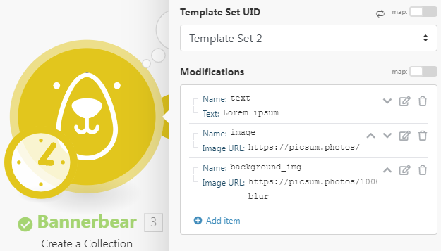 Note: The name of each item should reference the layer you wish to modify. If the layer is called "image_container_1", you must reference that exact name in Make and include the necessary modification for that layer i.e. the Image URL in this instance. If you have layers with the same name within your template set, the API will not differentiate between them, and the same data will be sent to all similarly named layers within the set.