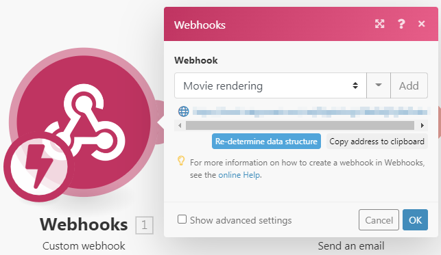 Note: This will generate a webhook URL, which you should copy and paste into the "Webhook URL" field in the Create a Movie module mentioned in the above scenario.
