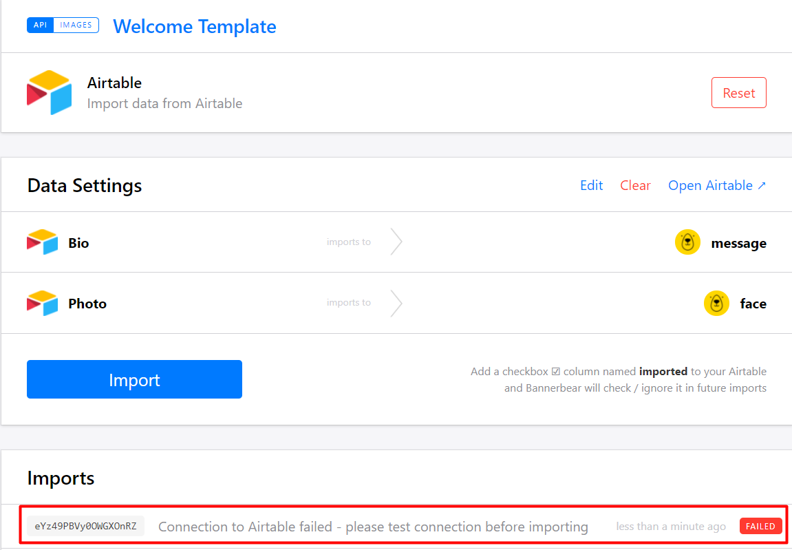 If you have multiple Airtable accounts, it's best to always update both the Airtable API key and base/table linked in your Bannerbear account before importing.