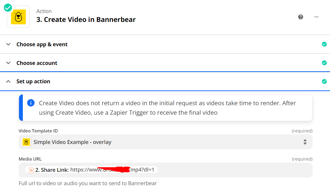 The sequence is done with Dropbox (New file in folder) as a trigger > Text Formatter by Zapier > Create Bannerbear Video as Action.