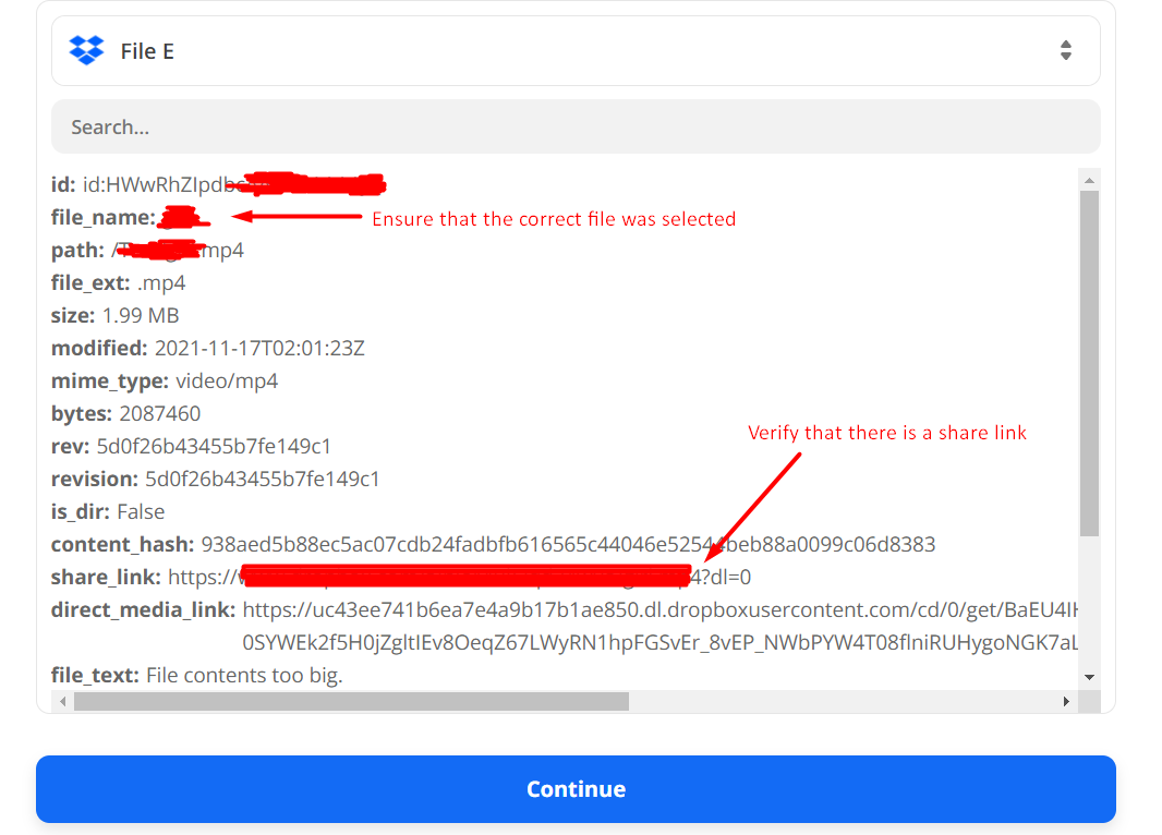 - Verify that a share_link was generated for that file