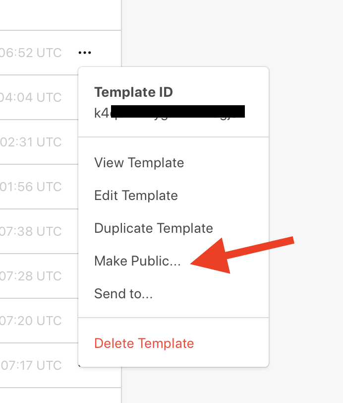 Bannerbear has a "Public Templates" feature that enables designers to add templates to a public profile page, which can be shared with anyone. Templates on this public profile page can be added to any project, by anyone. To make any template public, select the "Make Public…" option in the template dropdown menu.